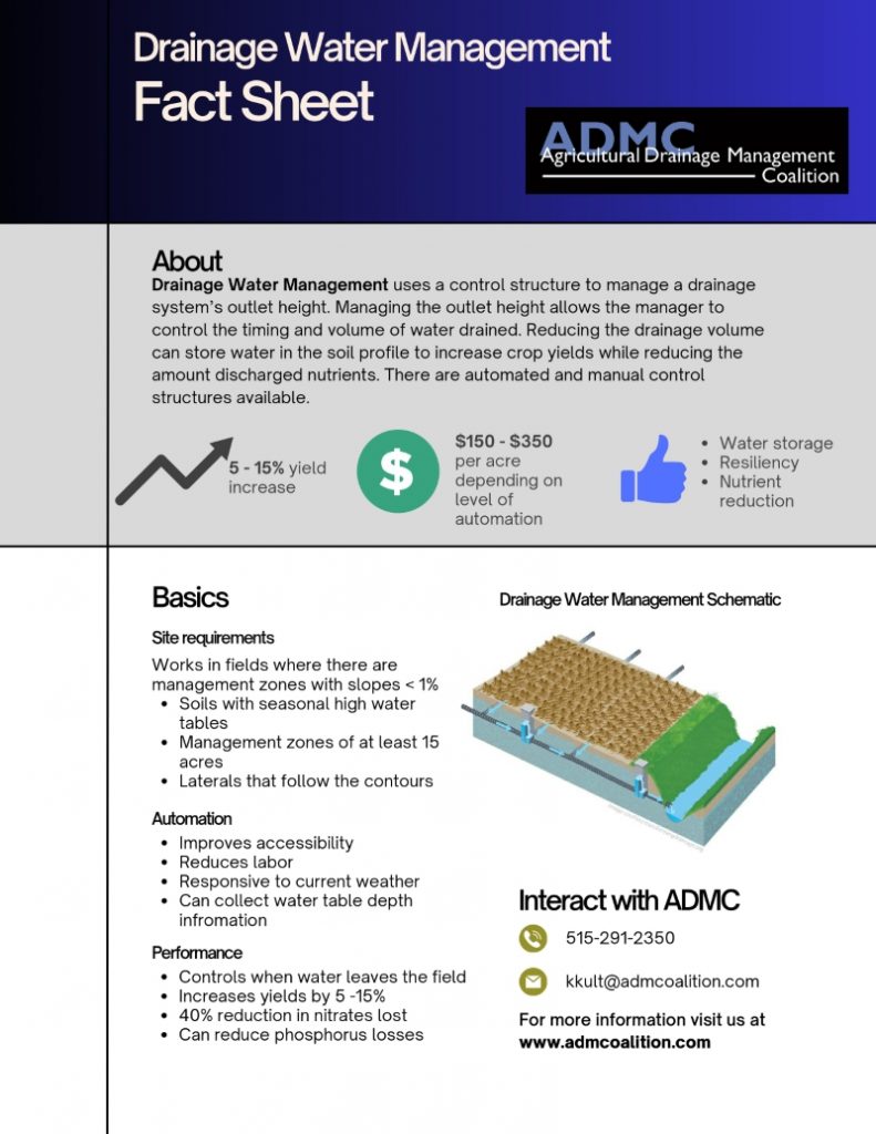 Drainage Water Management (DWM) is a low cost, effective water conservation practice that controls soil water table elevations and the timing of water discharges from subsurface agricultural drainage systems. DWM simultaneously improves water quality and the soil environment for better crop yields, on average from 5 to 15 percent.